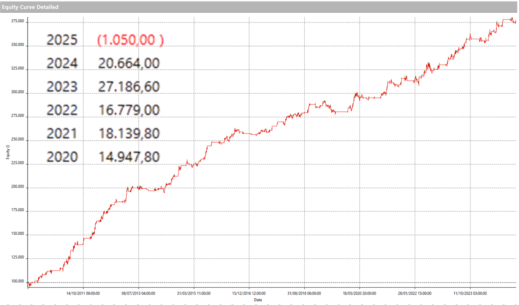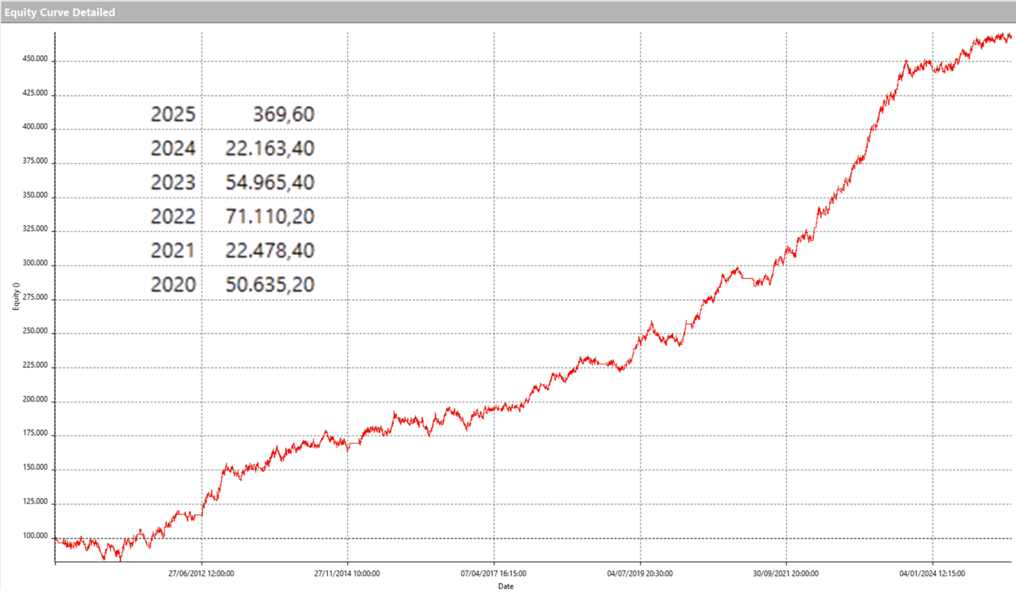 The equity line shows consistent performance, although with a slightly different slope in recent years compared to the 2020–2023 period.