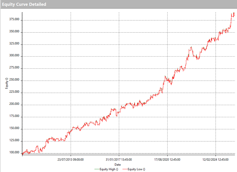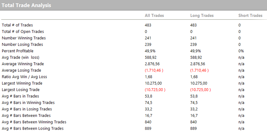 The average trade value is also impressive, with an average of around €600 per trade, offering a wide margin to absorb slippage and commission costs when deploying this system in live markets.
