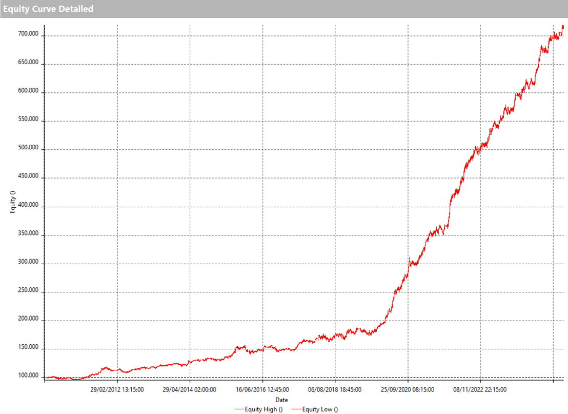 It’s a very straightforward but highly effective strategy. Key metrics show consistent performance, a solid net profit-to-drawdown ratio, and a solid average trade value of $177, especially given the high frequency of trades.