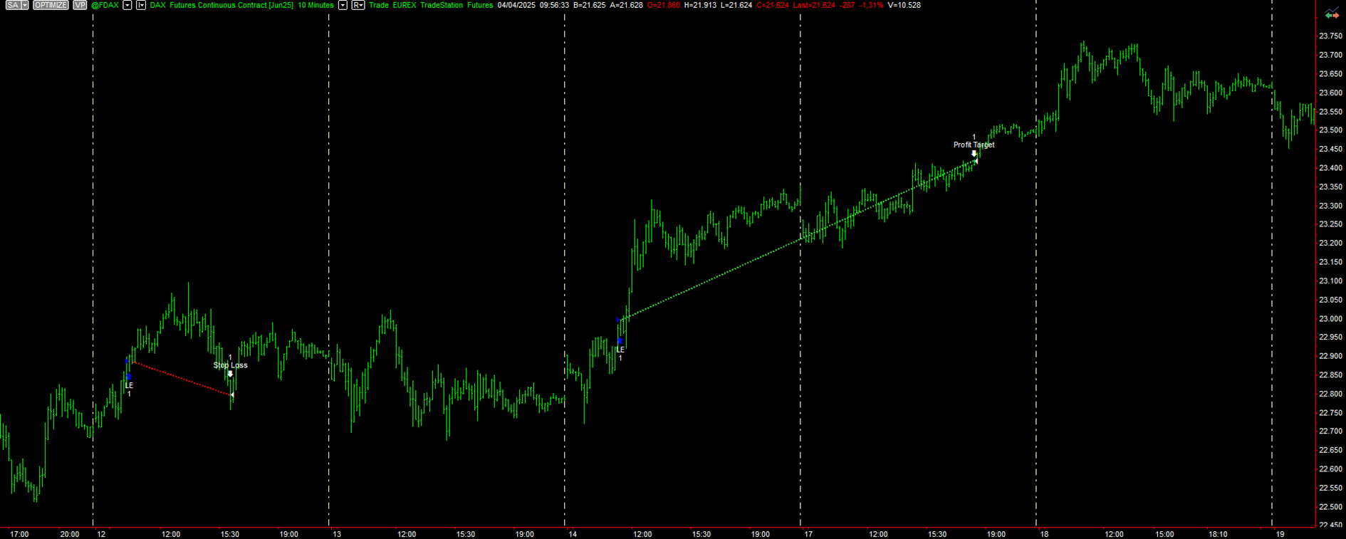 Figure 1 – Example trades executed by the multiday breakout strategy on DAX Futures (FDAX).