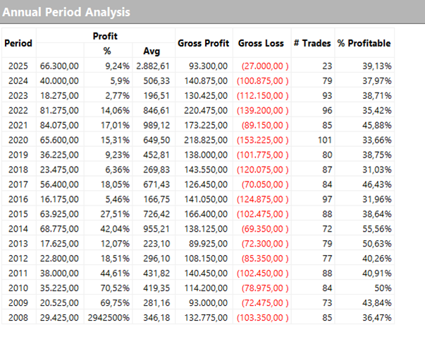 Figure 3 – Annual results of the multiday breakout strategy on DAX Futures (FDAX).