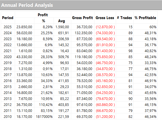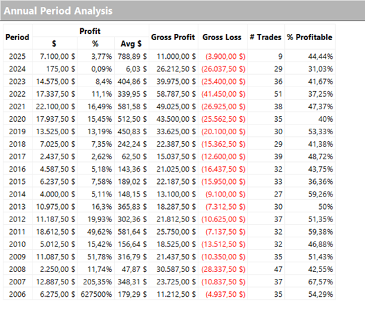 This is a very simple but effective strategy. Below are the key metrics shown based on historical data from 01/01/2010 to 03/31/2025.