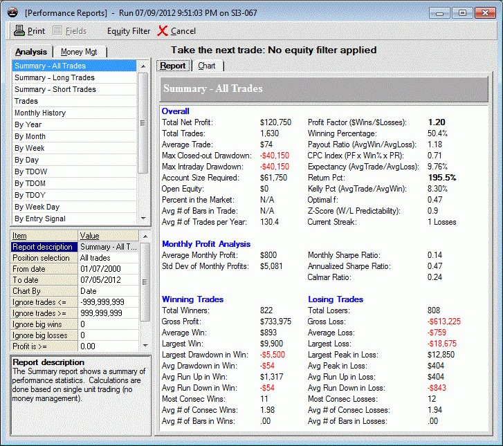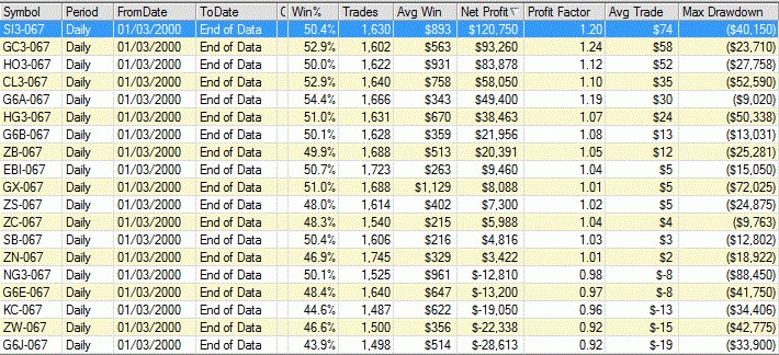 The tests are run without considering slippage and commissions as the purpose is not to build a winning system but to compare market behavior.