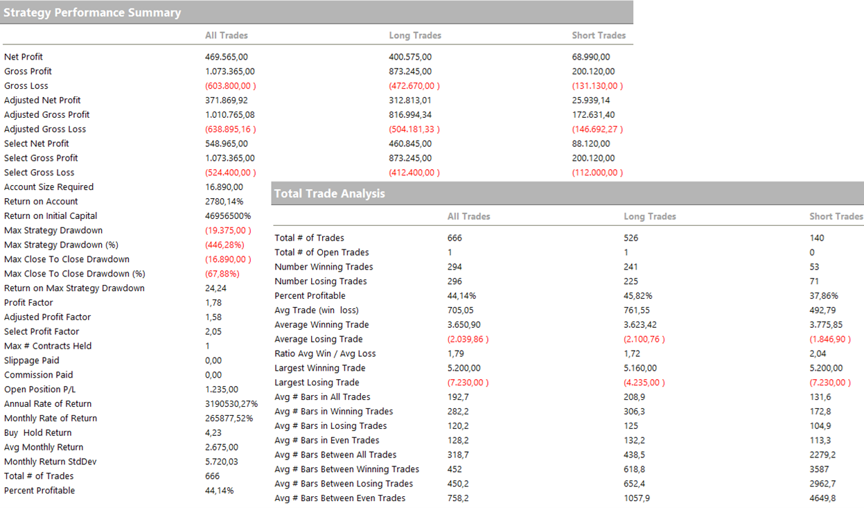 Next, let’s look at the Total Trade Analysis and the Strategy Performance Summary. As expected, this strategy executes more trades than the previous one, with an average trade size of around $140. Despite that, the maximum drawdown remains impressively low, just $8,000, even for an intraday system.