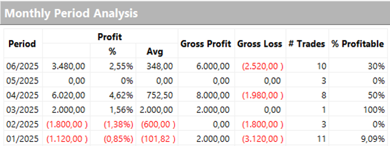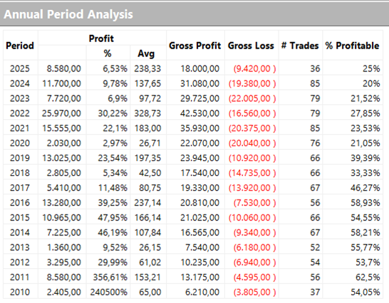 When examining the yearly returns, we can see that this is a highly consistent system. It performed very well in 2025, even during challenging months like March, April, and June, delivering solid profits in those periods.
