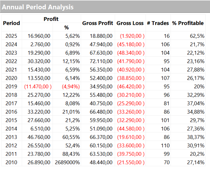 Analyzing the annual returns (Figure 4), we can see that the strategy performed well even in the most recent years, including the post-2022 period, which posed challenges for many traders. In particular, 2025 started off with excellent results, already recording a profit of nearly $17,000 in the first few months of the year, with a win rate of over 60%—a sign that the strategy is successfully capturing the market’s current dynamics.