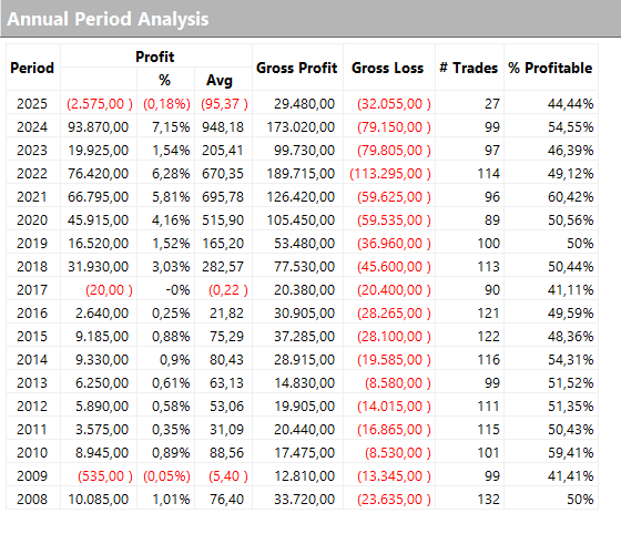 Si tratta di una strategia molto semplice ma allo stesso tempo decisamente efficace, di cui si riportano di seguito le principali metriche. Sottolineiamo in particolare la costanza dei risultati, l’ottimo rapporto net profit su drawdown ed un buon average trade (177$), considerata la mole di trade che effettua il sistema.