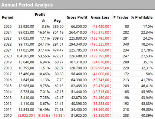 Una strategia molto semplice ma efficace, di cui riportiamo le principali metriche su dati dal 01/01/2010 al 30/04/25. Le performance della strategia si distinguono per un andamento piuttosto regolare, con un 2025 iniziato alla grande (38.000$ di guadagno) grazie alla volatilità e ai forti trend che si sono venuti a generare su questo mercato nei primi mesi dell’anno.