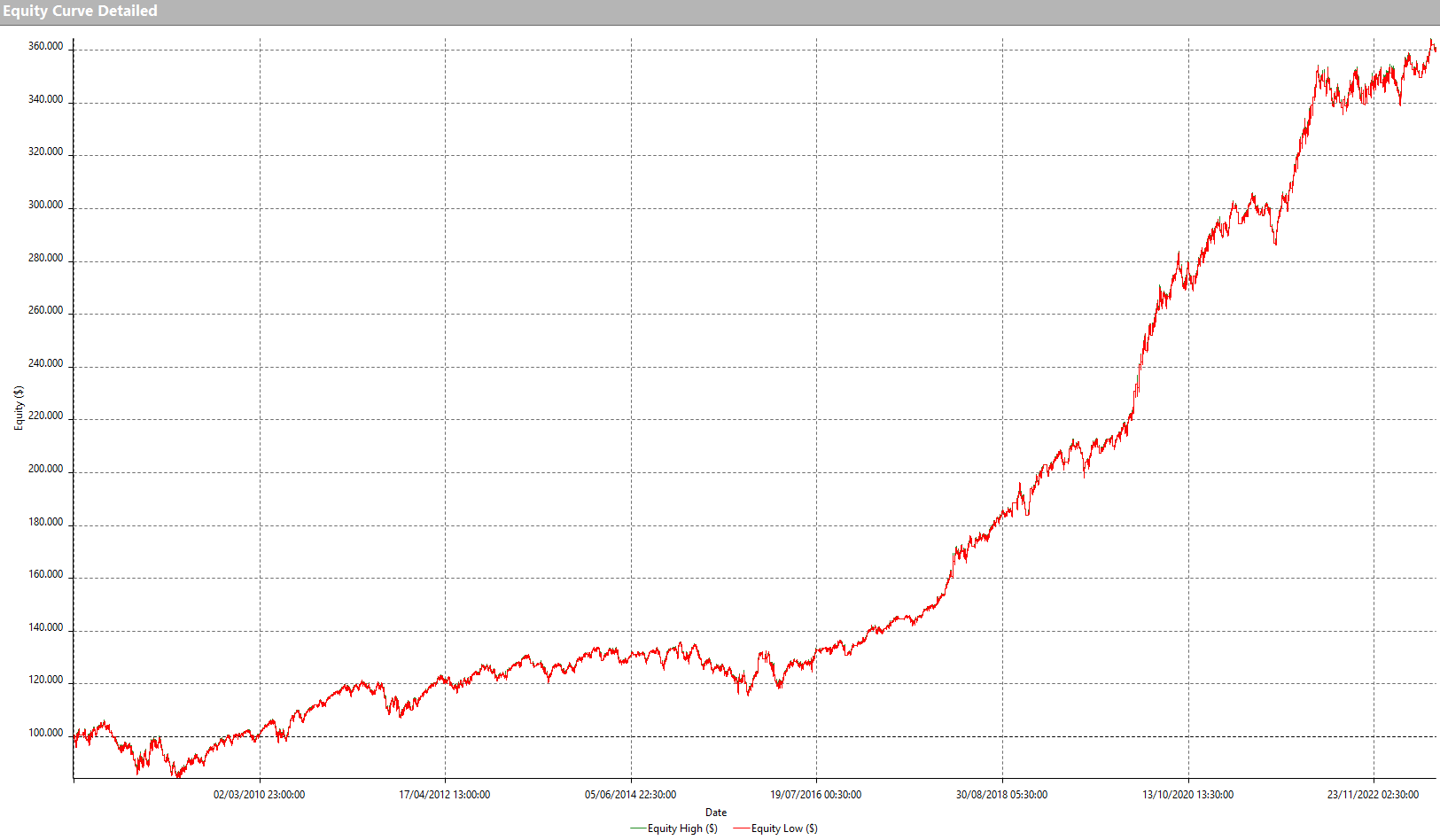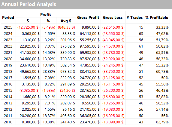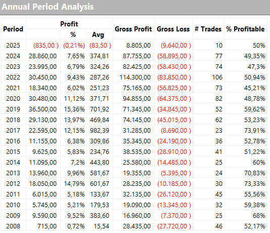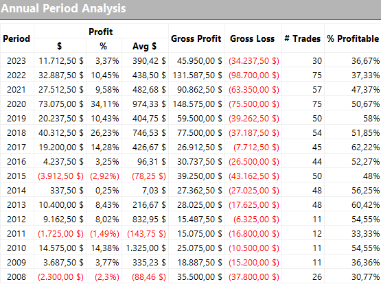 Si tratta di una strategia molto semplice ma allo stesso tempo decisamente efficace, di cui si riportano di seguito le principali metriche. Sottolineiamo in particolare la costanza dei risultati, l’ottimo rapporto net profit su drawdown ed un buon average trade (370$).