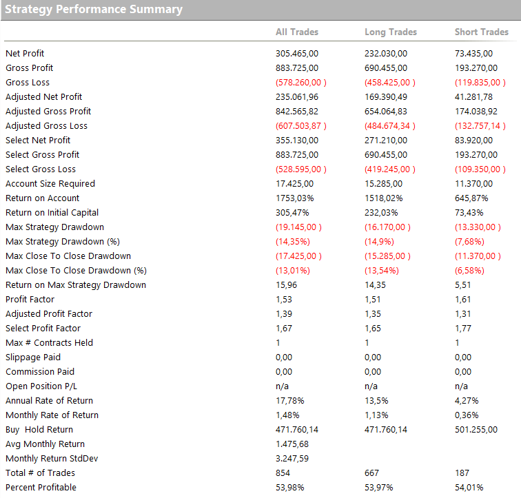 Da apprezzare particolarmente è il fatto che Luca ha codificato questa strategia, basata sulla logica dello swing di Larry Williams, in maniera totalmente autonoma. Le metriche non sembrano esaltanti ma il potenziale di questa strategia è davvero notevole!
