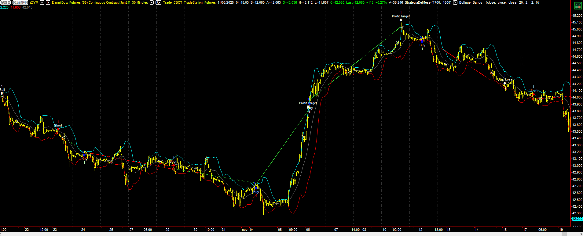 Si tratta di una strategia reversal su Dow Jones (YM) con time frame a 30 minuti, che utilizza le classiche bande di Bollinger per definire i momenti di inversione per entrare a mercato: long sul cross verso l’alto della banda inferiore, e short sul cross verso il basso di quella super****iore.