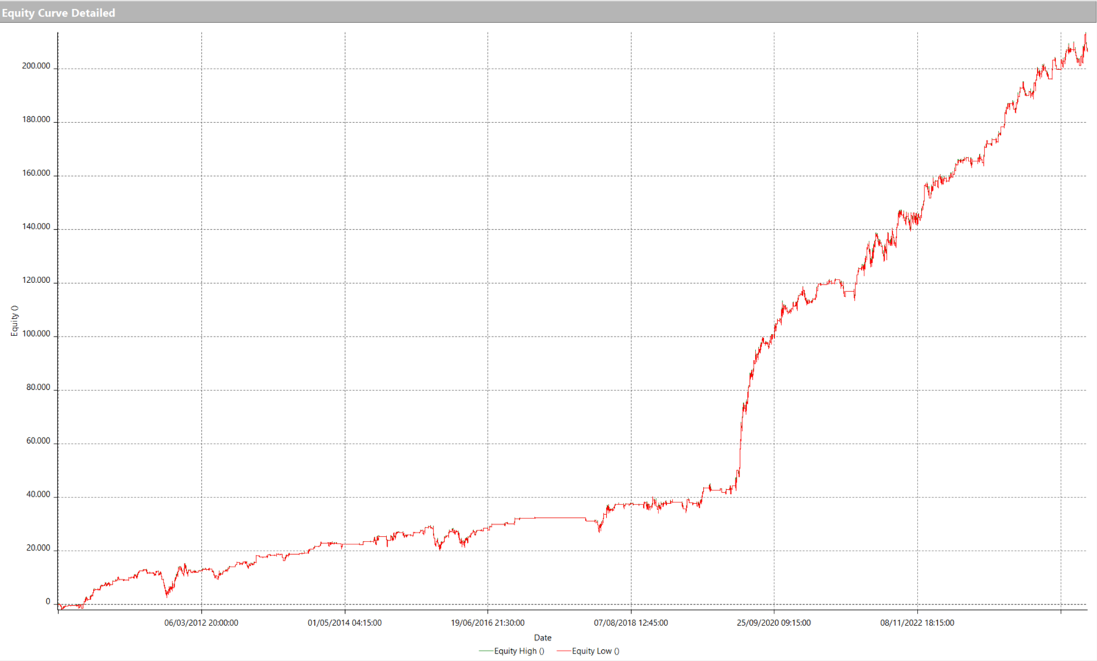 Qui di seguito possiamo osservare l’equity line di tutto lo storico del sistema dal 2010 ad oggi. È evidente come questo tipo di approccio sul future @ES abbia iniziato a performare veramente bene a partire dal 2020, anno della pandemia, grazie al forte aumento della volatilità su questo mercato, indispensabile per sistemi di questo tipo.