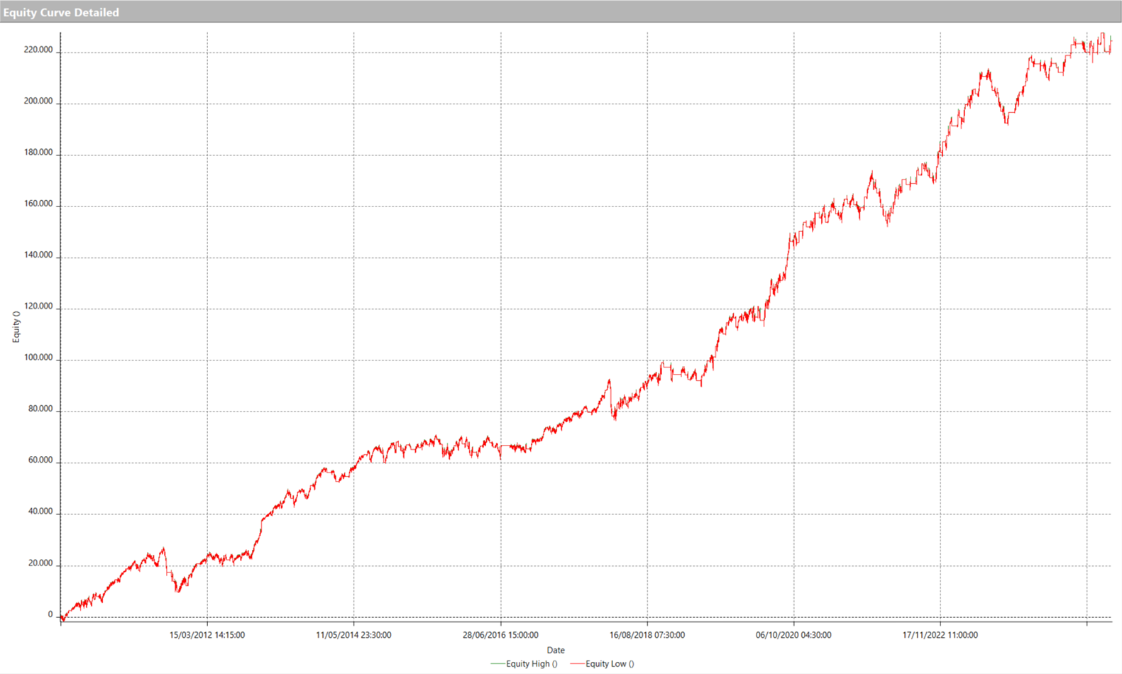 Analizzando l’Equity Curve Detailed, vediamo una curva con un andamento crescente, che ha prodotto performance positive con una interessante regolarità.