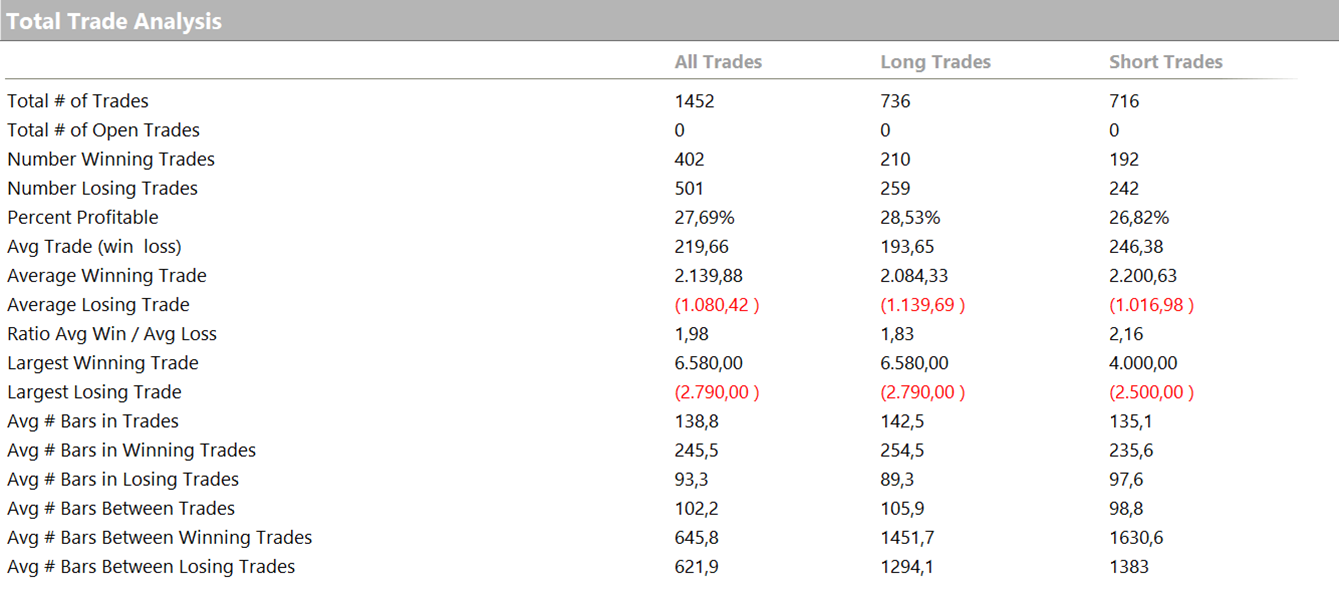 La Total Trade Analysis (Figura 3) mostra un average trade pari a 219,66$, un valore ottimo considerando il sottostante. Questo dato rende il sistema ampiamente capace di coprire slippage e costi operativi, requisito fondamentale per la reale applicabilità in live trading.