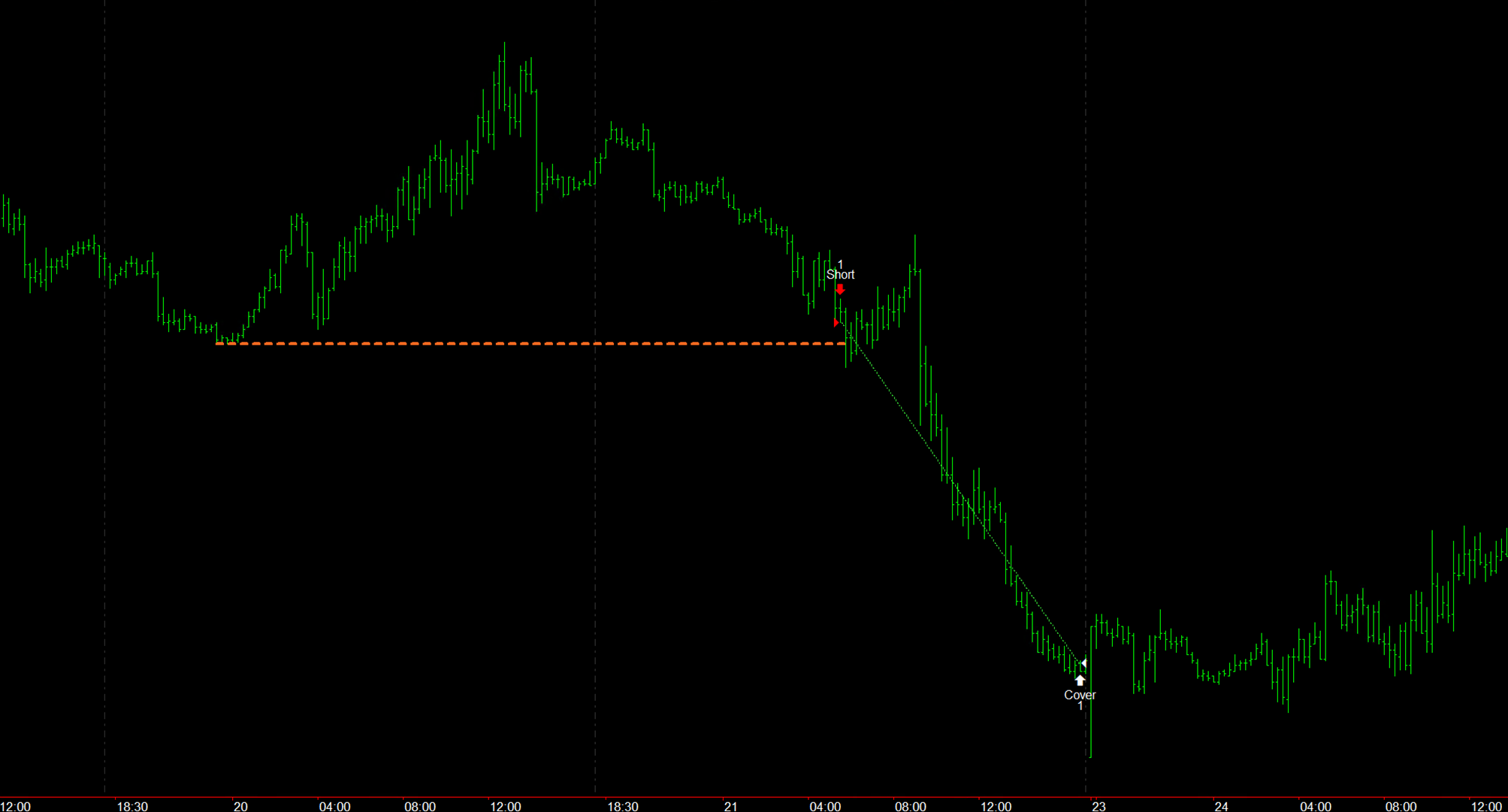 Figura 5 – Esempio di ingresso short anticipato effettuato dalla strategia breakout sul future del Crude Oil.