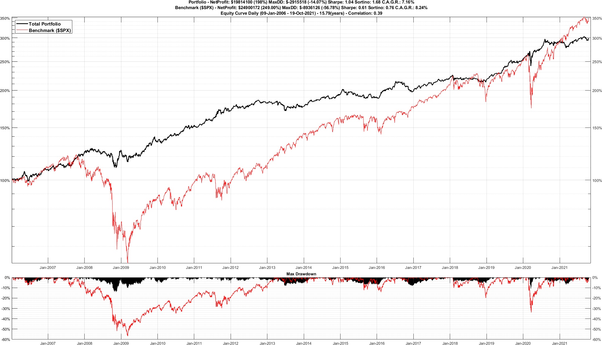 Per quanto riguarda il periodo a cavallo tra il 2008 e il 2009, vediamo che il modello ha subito leggere perdite e un drawdown massimo del 14.07%.