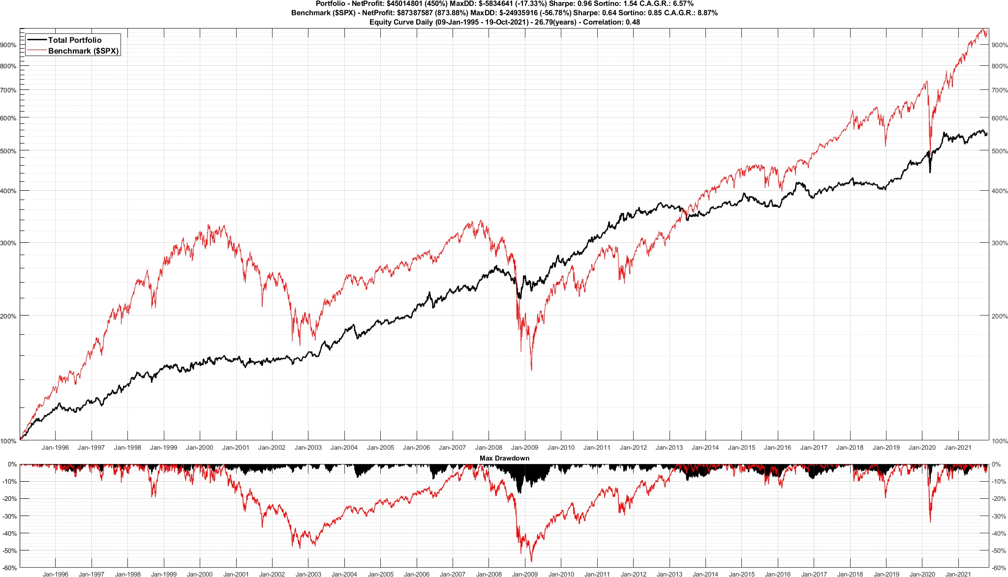 Sebbene questi numeri non sembrino particolarmente allettanti, essi assumono maggior interesse se consideriamo ciò che è successo al benchmark, l’S&P, che nel medesimo periodo ha avuto un drawdown del 57%, come evidenziato dalle equity line qui sotto (in nero il modello Permanent Portfolio, in rosso il benchmark).