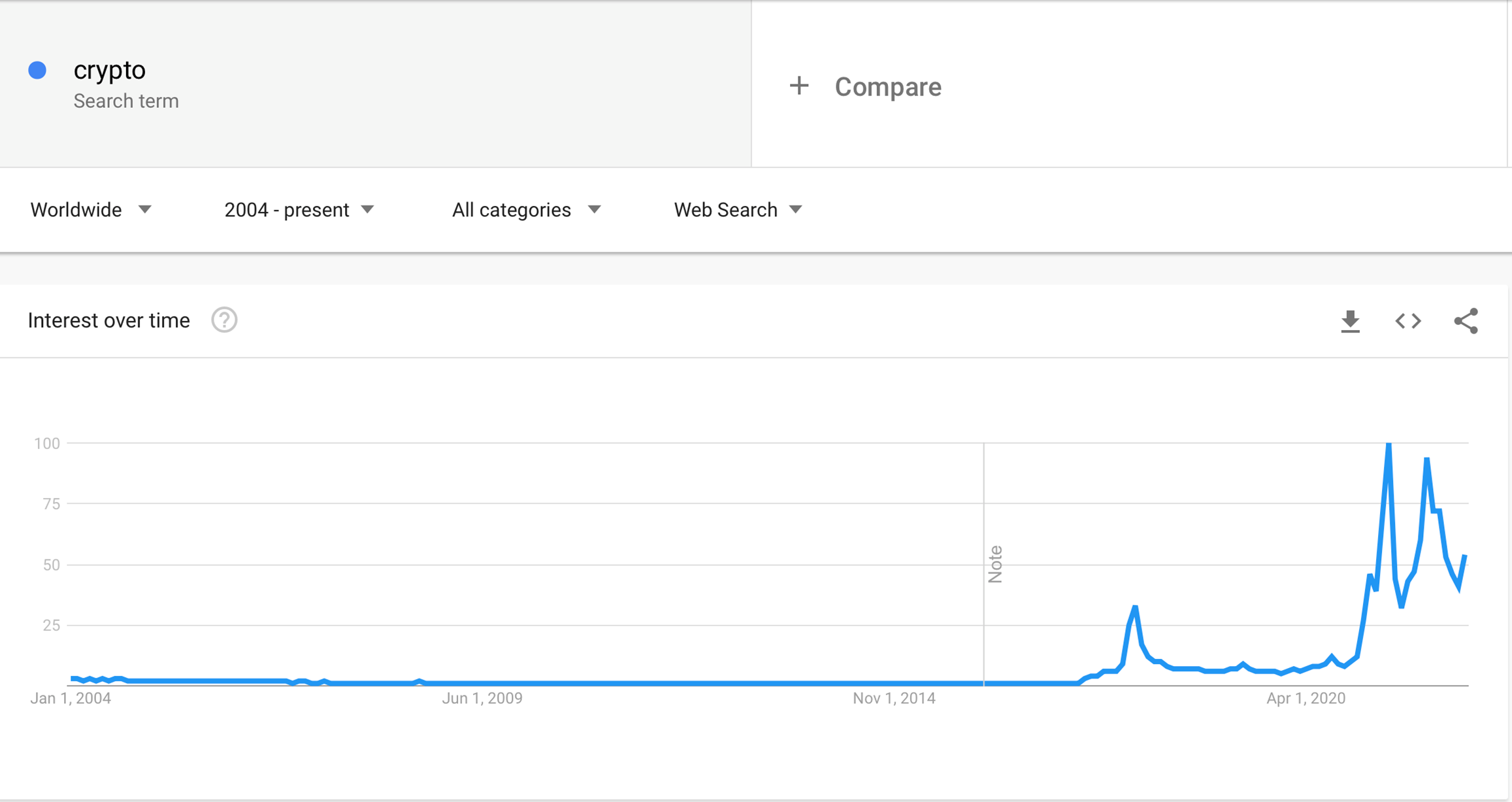 Come evidenziato dal grafico, prima del 2018 le cripto erano il dominio di esperti informatici, nerd e appassionati, mentre di recente sono diventate oggetto di interesse per molte persone.