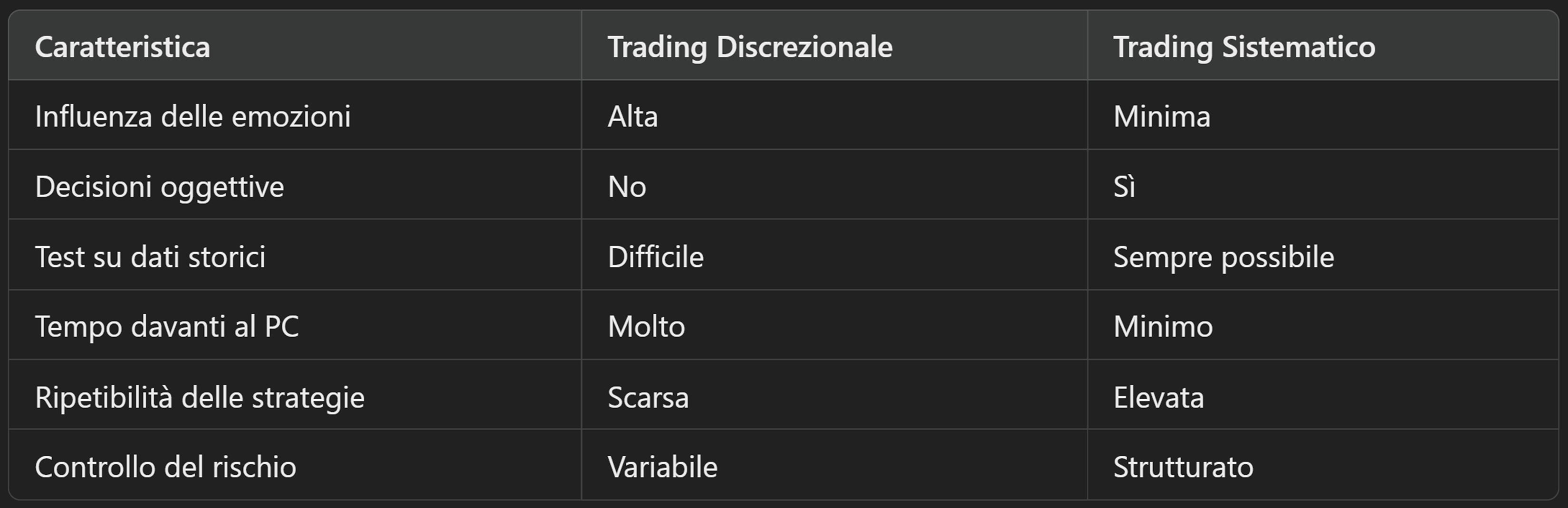 Parti totalmente da zero e ti stai chiedendo se il trading sistematico fa al caso tuo? Prima di cominciare sappi che il trading è una disciplina complessa che richiede studio, strategia e una solida gestione del rischio. Tra i diversi approcci disponibili, il trading sistematico viene considerato la migliore soluzione per chi vuole operare con metodo e disciplina.