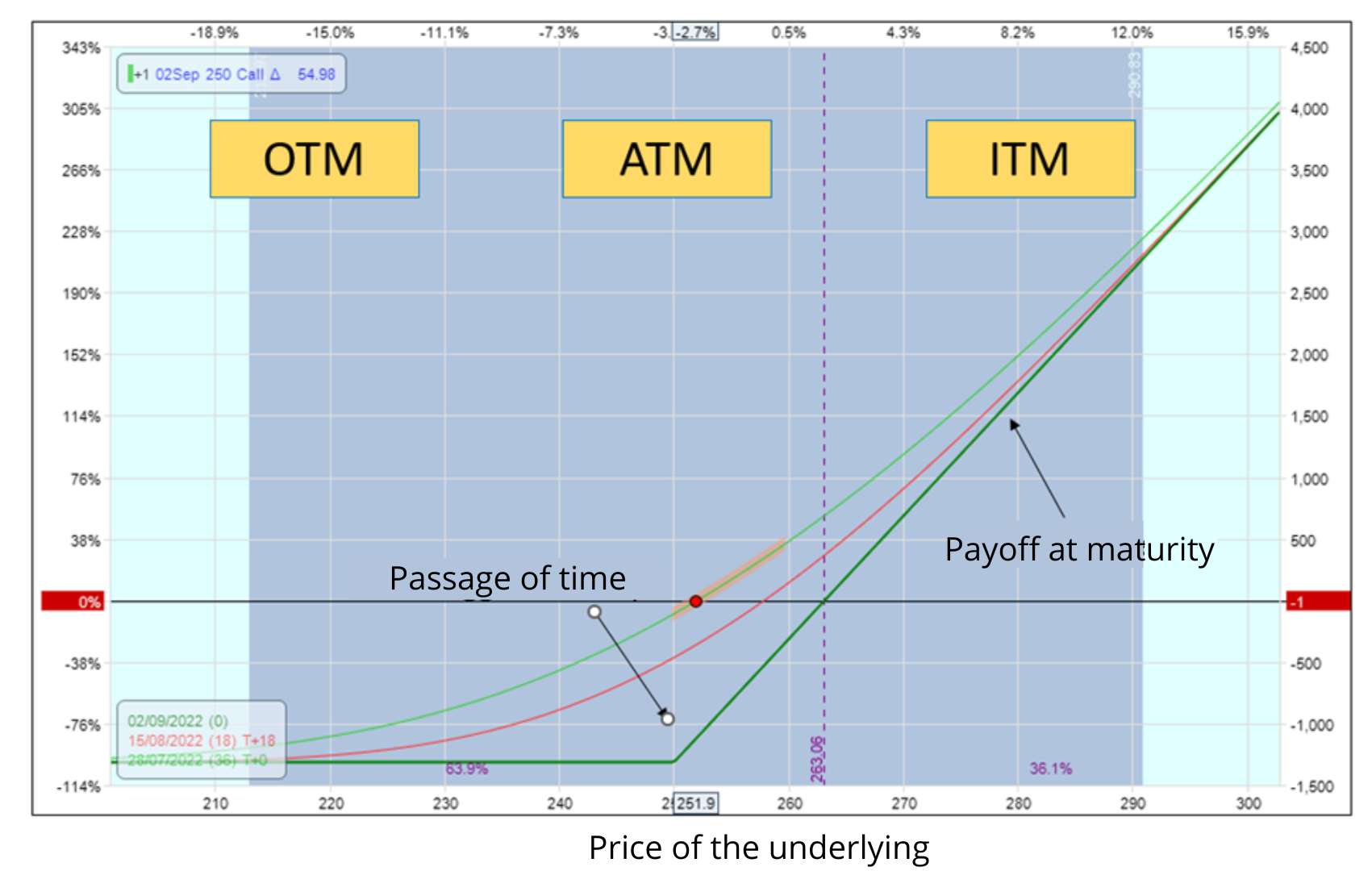 In technical terms, the amount the holder would earn if he/she exercised the contract is called the “payoff.” The difference between the strike price (K) of the option and the market price (P) of the underlying asset is called the “moneyness”.