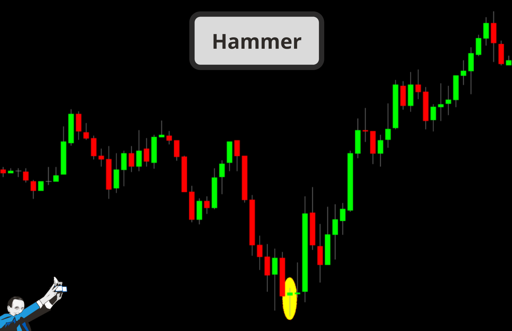 A hammer is formed when a candlestick shows a small body and a long lower shadow. The shadow must be at least twice the size of the candlestick’s body. The lower shadow indicates that the price was pushed down by sellers before buyers brought the price back above the opening level.