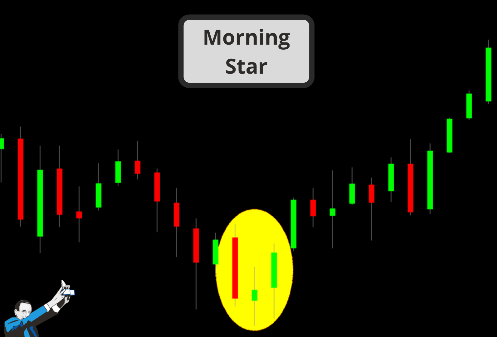 The morning star pattern includes three or more candlesticks and is recognizable by its large bearish candlestick, followed by a small bullish or bearish candlestick with a smaller body than the candlestick’s shadow, then followed by a large bullish candlestick.