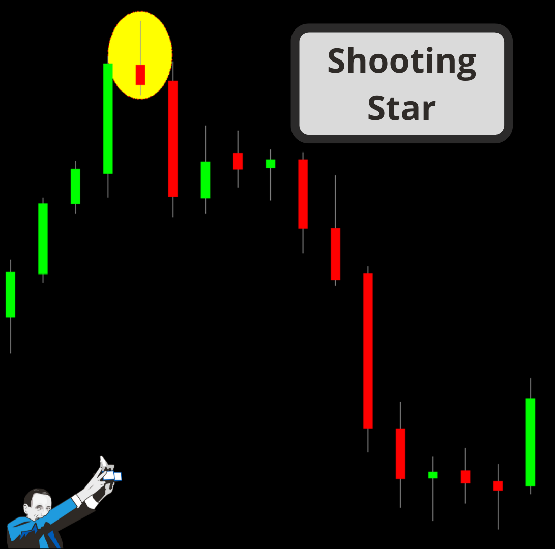 Sticking with our cosmic theme, a shooting star is a bearish candlestick with a long upper shadow, minimal or no lower shadow, and a small body approaching the day’s low. It’s a pattern that appears at the end of an uptrend.