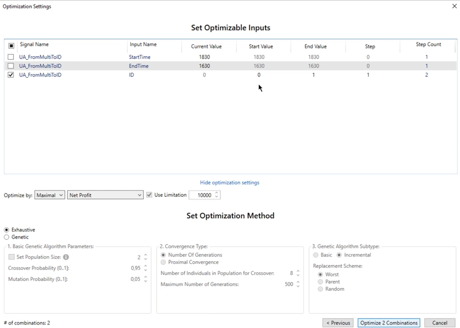 Optimization is a form of backtesting in which, instead of testing the strategy with a single set of parameters, different tests are made using ranges of values and the resulting metrics are compared (profit, loss, average trade, drawdown, number of trades) to find settings that can improve the effectiveness of the strategy.