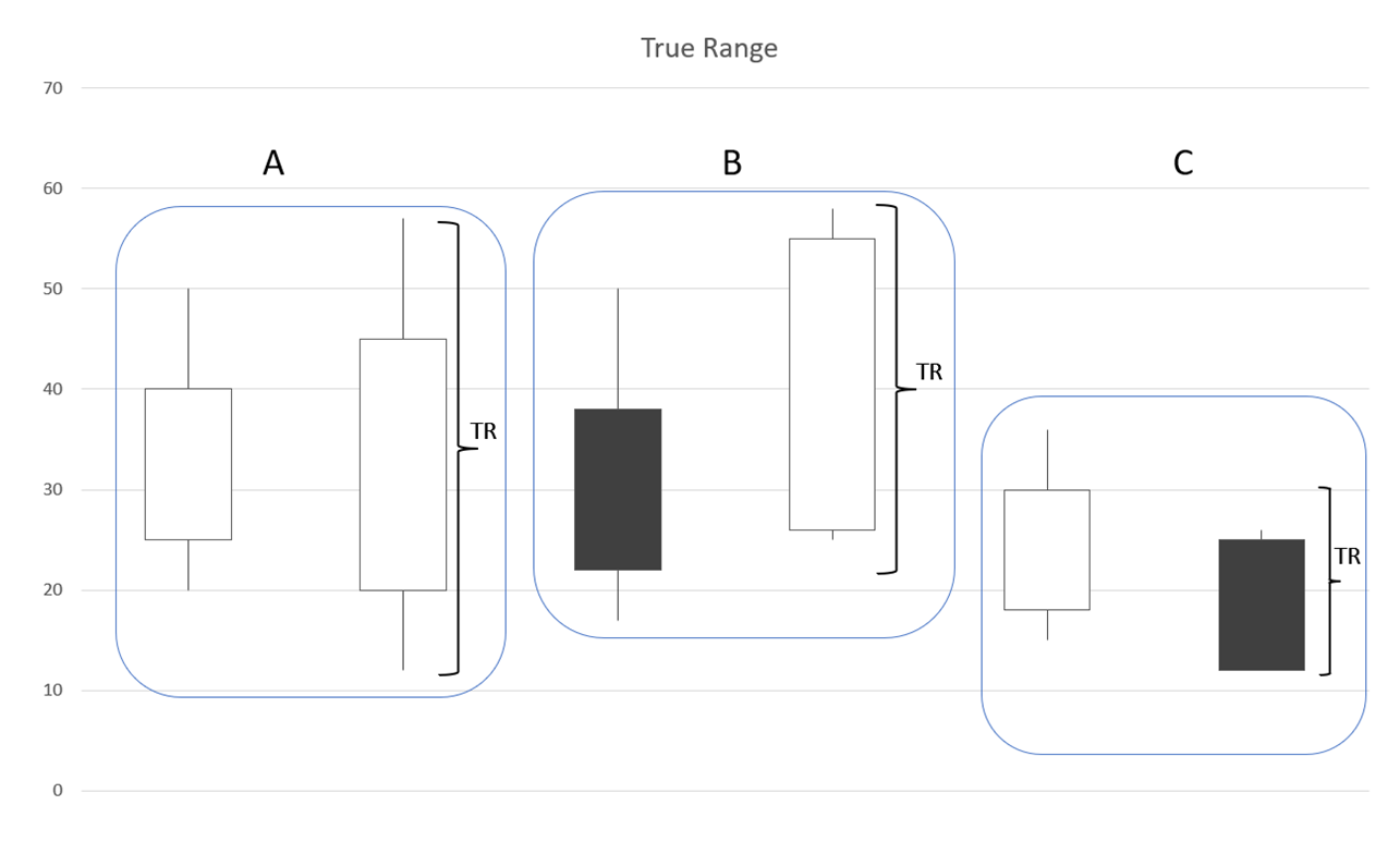 As the name suggests, the ATR measures the average “true range”, which is defined by three values:
