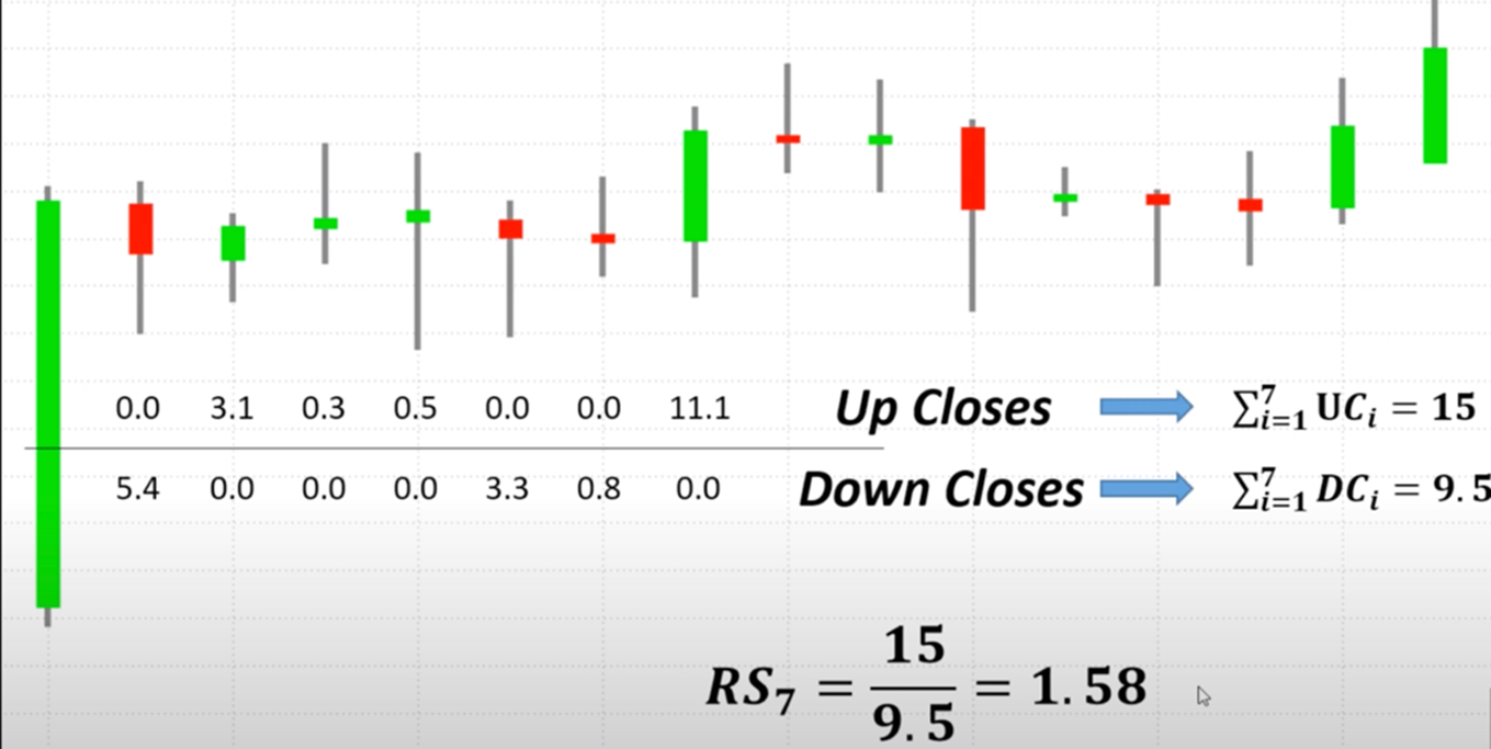 The RS is simply defined as the ratio of the sum of Up Closes to the sum of Down Closes. In other words, just add up all the Up Closes, add up all the Down Closes, and divide the first number by the second: