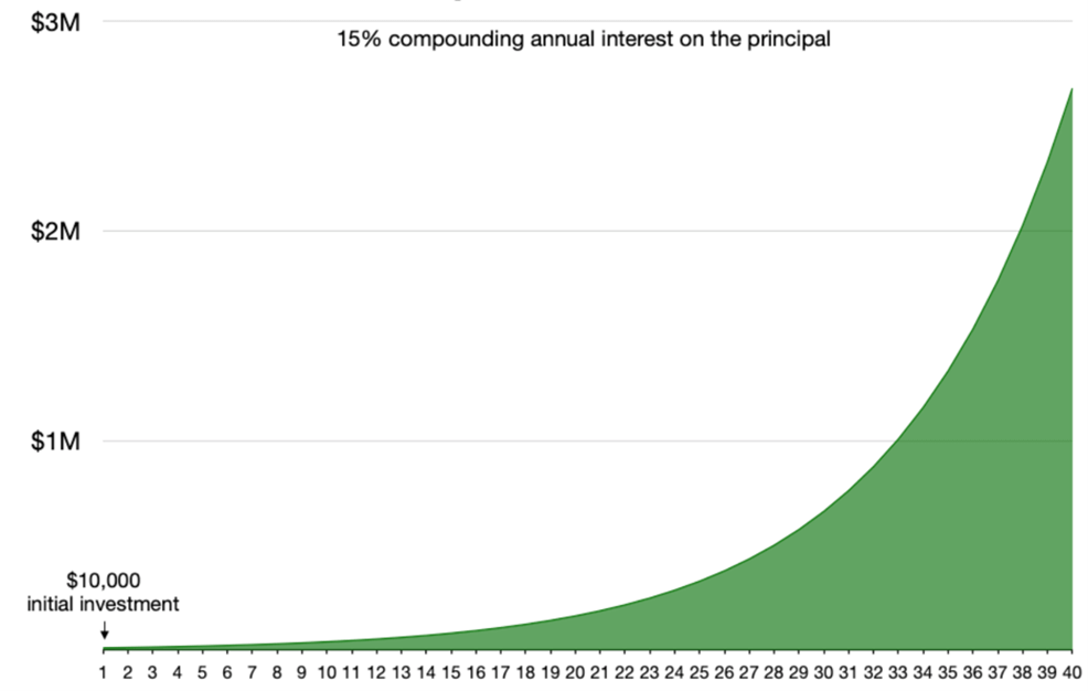 Consider, for example, the picture below, which shows the path of one’s earnings over 40 years, considering a compound annual interest rate of 15%.