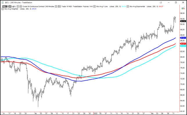 The following chart shows the trend of the three moving averages (200 periods) for Crude Oil price.