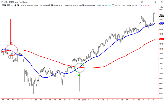 In general, there is a tendency to mix a “slow” moving average, such as a 200-day moving average, with a “faster” moving average, such as a 50-day moving average.