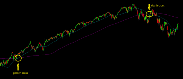 Conversely, if it crosses downward, the indicator is bearish (the so-called “death cross“).