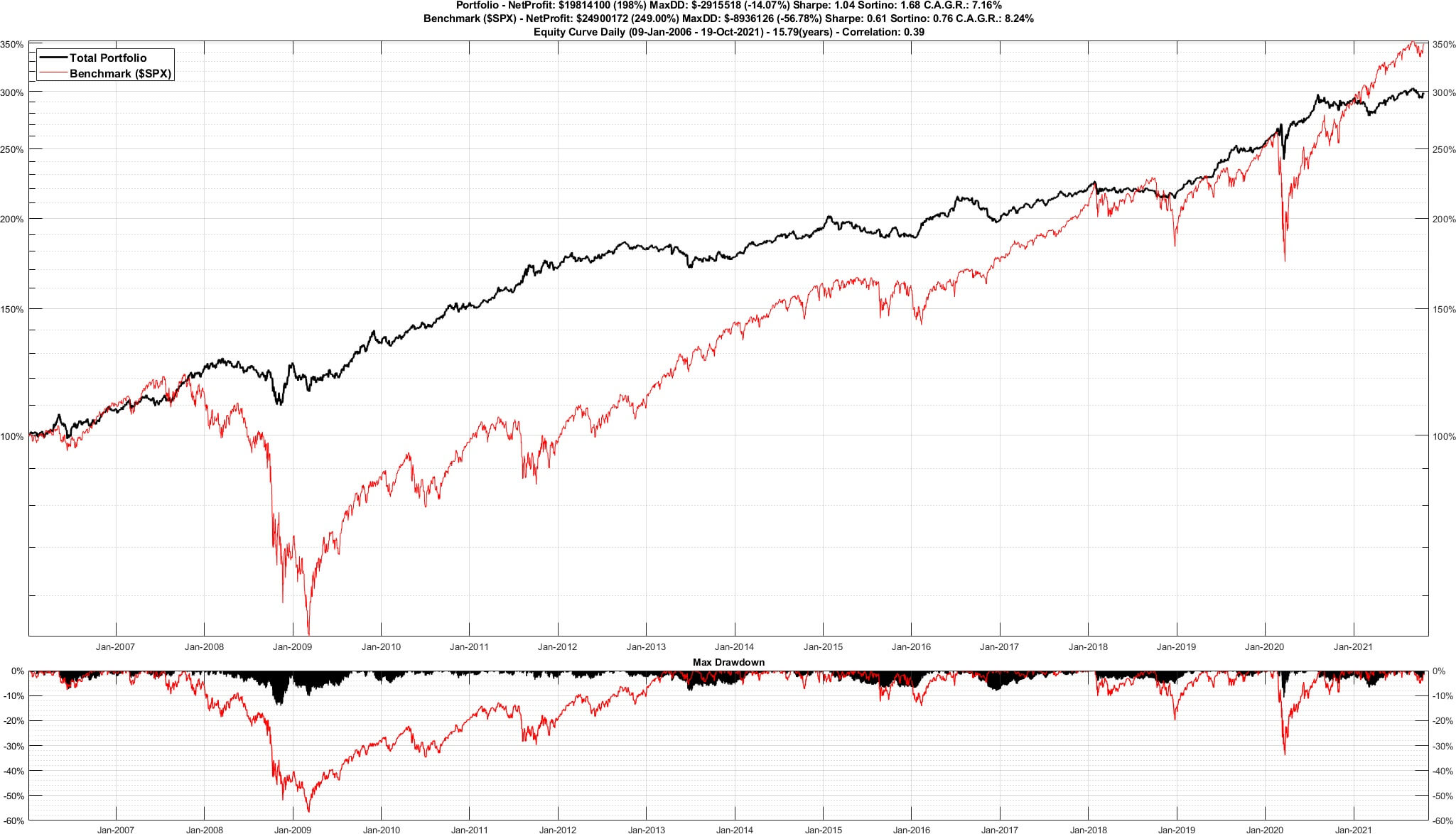 Although these numbers don’t seem particularly attractive, they take on greater interest when we consider the benchmark, namely the S&P, which had a 57% drawdown over the same period, as shown by the equity lines below (in black the Permanent Portfolio model, in red the benchmark).