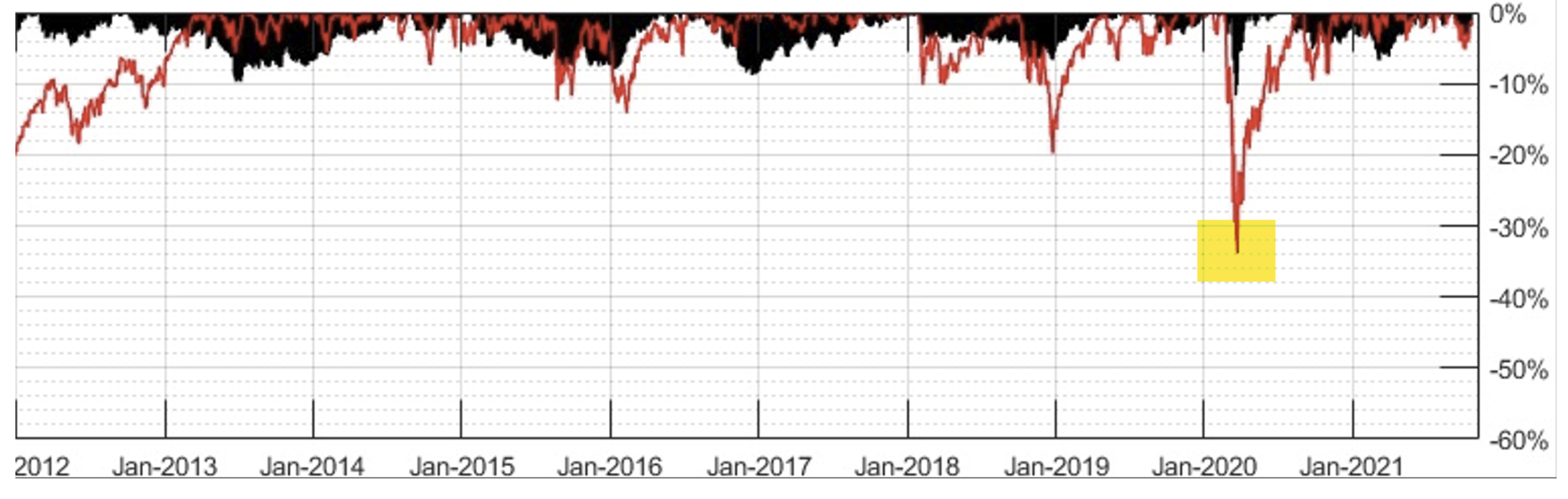 In the chart below we can see a cusp that corresponds to the crisis triggered in the markets by the pandemic. Again, we note that our setup didn’t exceed a 12% drawdown, compared to 30-35% for the benchmark.